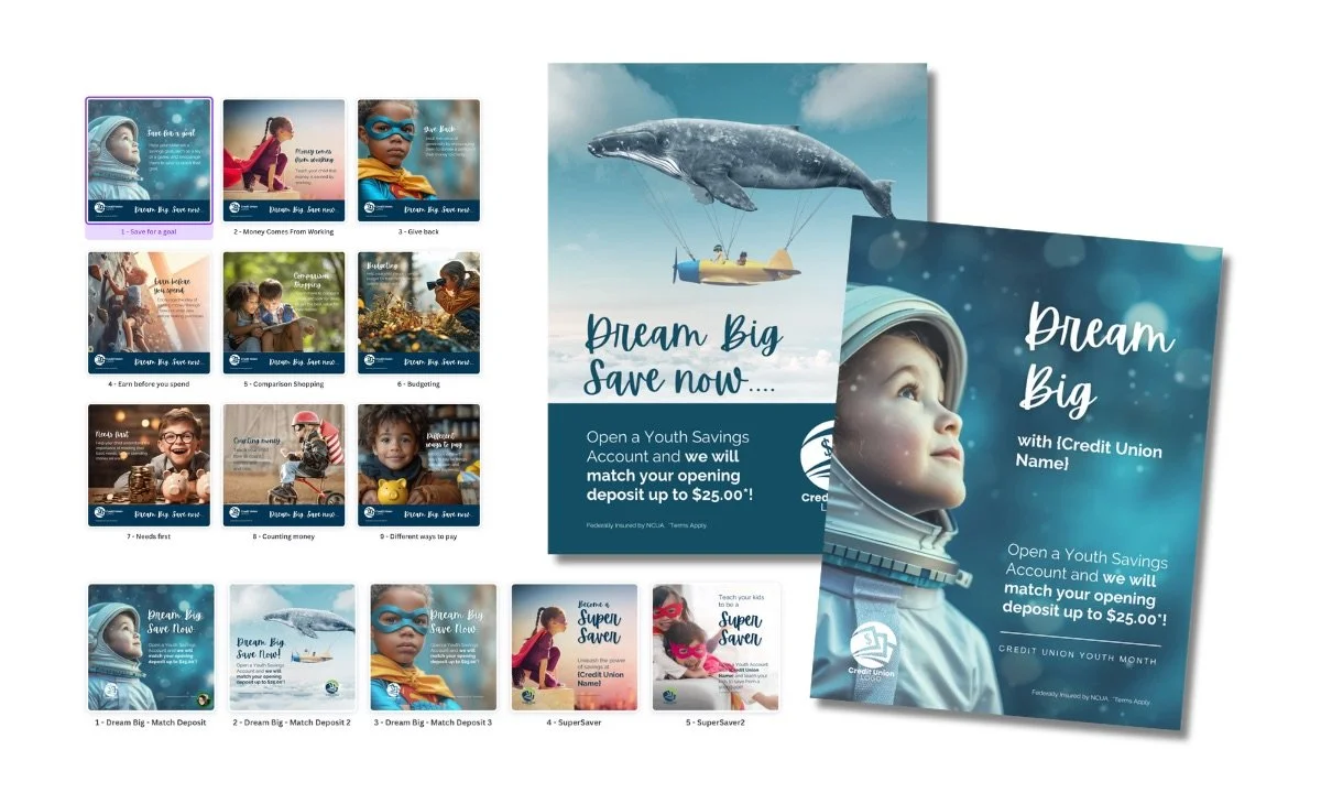The theme “DREAM BIG, SAVE NOW” is supported by a kit of materials that can be customized by your credit union using Canva, including: