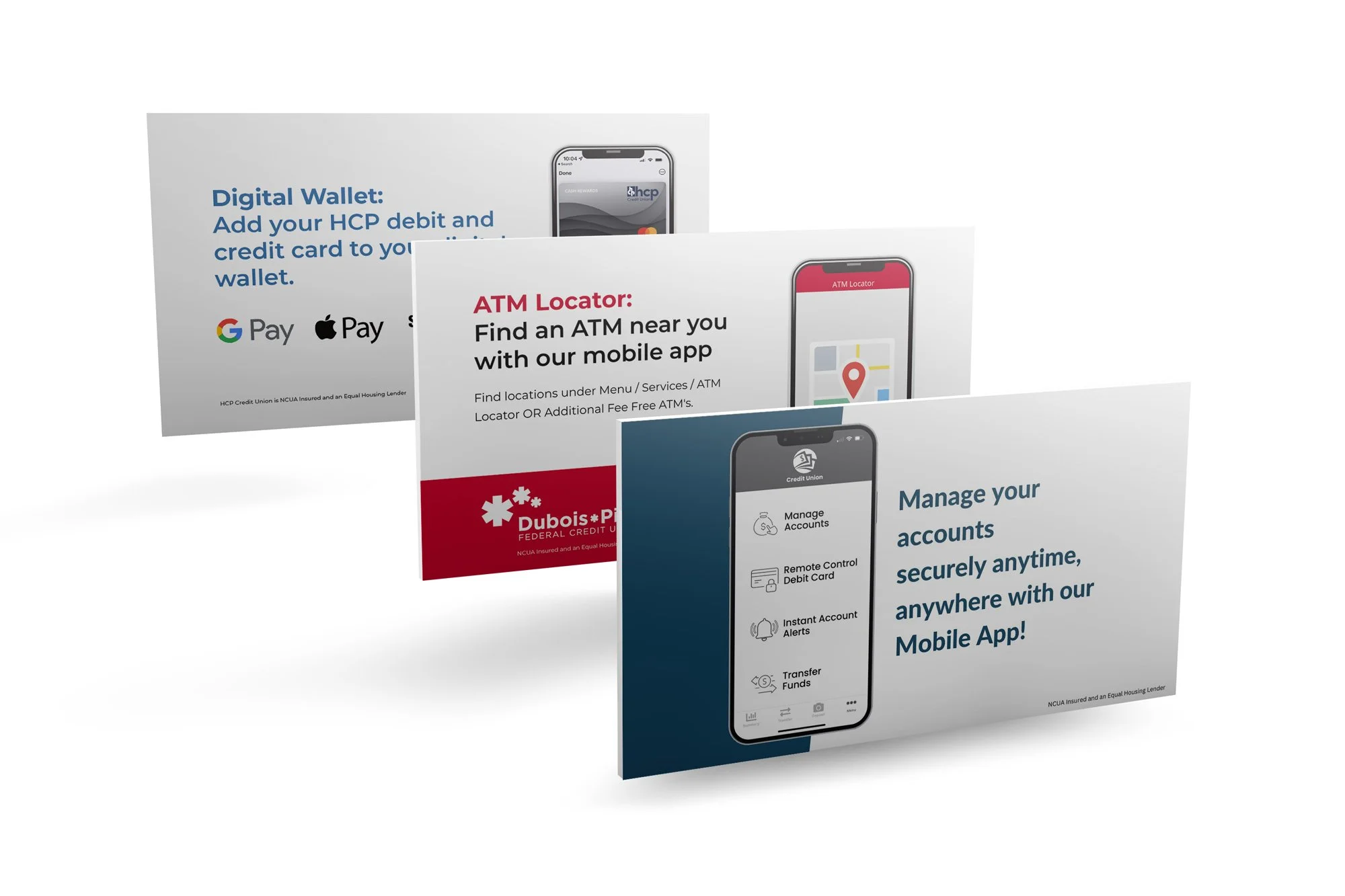 You will have many elements to create during conversion, including letters, website copy, direct mail, lobby artwork, tutorials, mockups, and other transition content. We have them on hand, ready to match your CU branding.